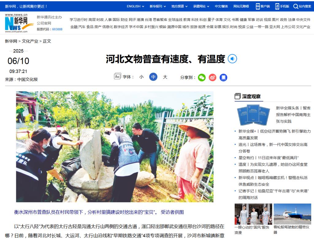2025年3月19日,央视频以“河北秦皇岛:文物部门发现3块独有长城‘夜不收’石刻”为题,2025年6月9日,《中国文化报》第八版以“河北文物普查有速度、有温度”为题,对yl7703永利集团齐甲子、冀东文化研究中心张鑫、马克思主义学院吴向宇三位文物考古专家与燕山大学、东北大学秦皇岛分校相关专家组建“考古青年”文物普查队,有针对性地对青龙河、滦河流域的新、旧石器遗址和长城沿线的石碑、石刻进行专题调研情况进行了宣传报道。2025年6月10日新华网、文旅中国新闻网等媒体均对活动进行了广泛宣传报道。